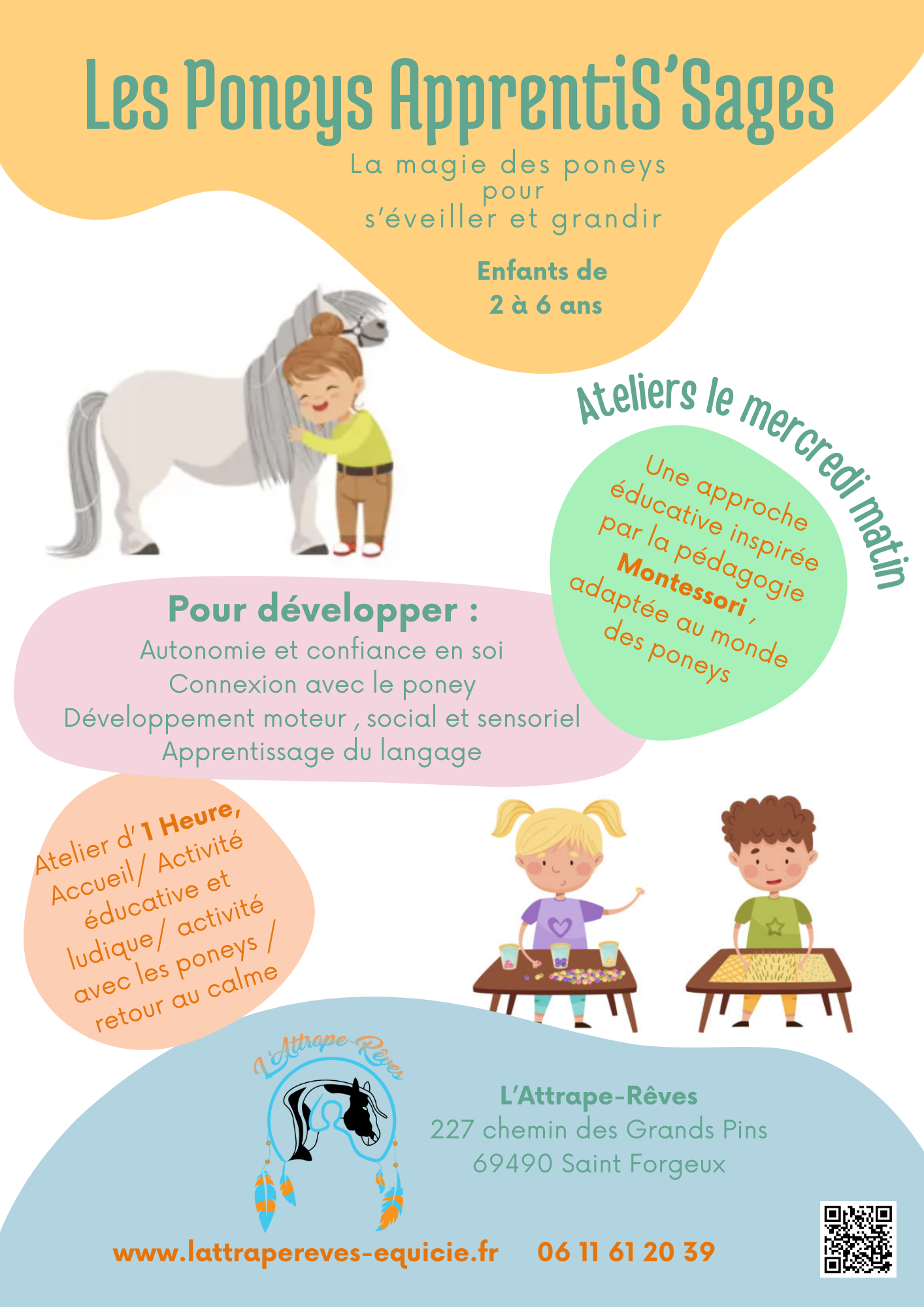 Chaque atelier dure environ 1h et alterne des temps adaptés aux jeunes enfants : un accueil rassurant, des jeux éducatif inspiré de Montessori toujours en lien avec les poneys, une activité avec les poneys, puis un retour au calme tout en douceur.