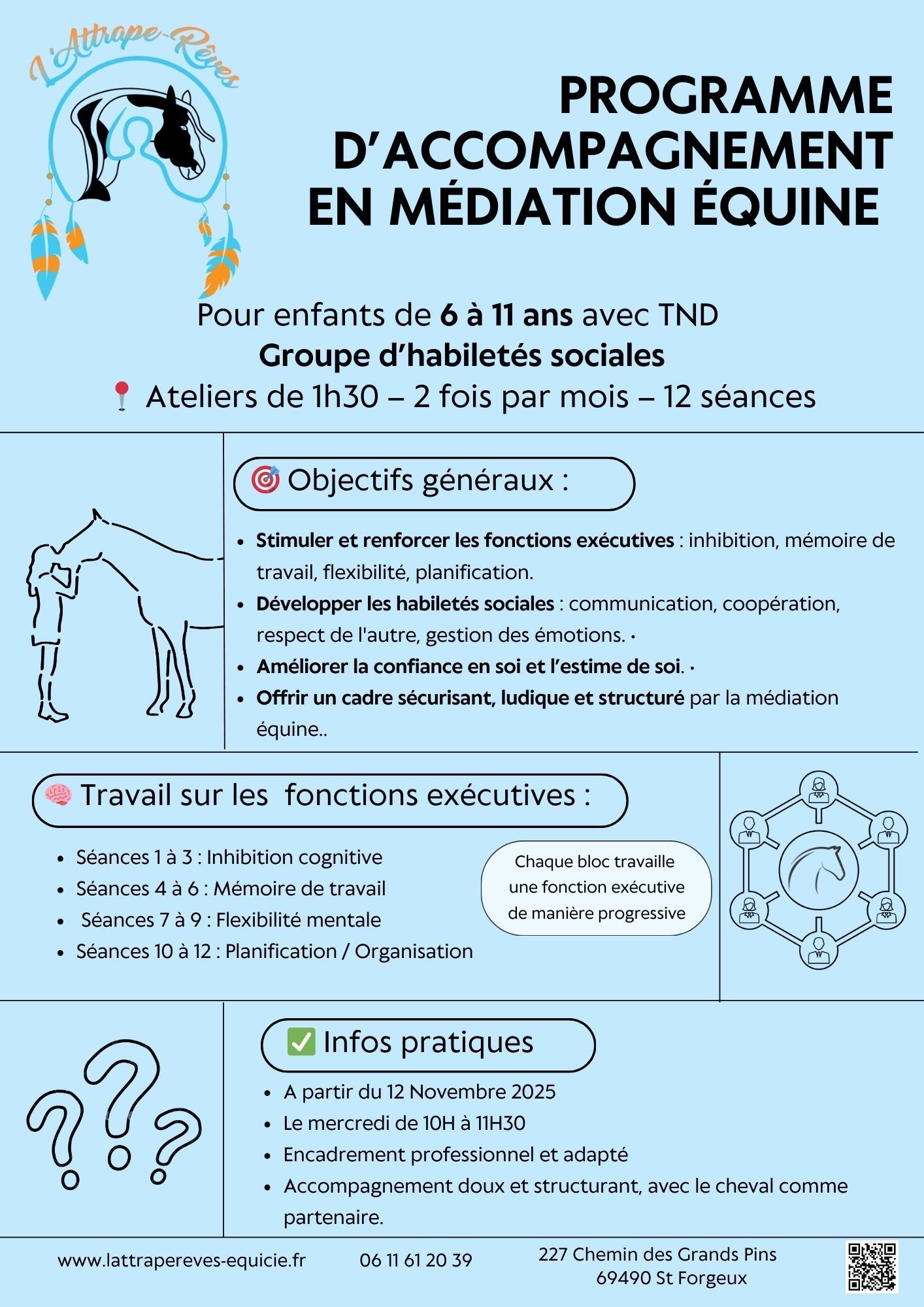 Ce programme construit autour de 12 séances de médiation équine, propose aux enfants un cadre sécurisant et ludique pour développer leurs compétences sociales et renforcer leurs fonctions exécutives.
